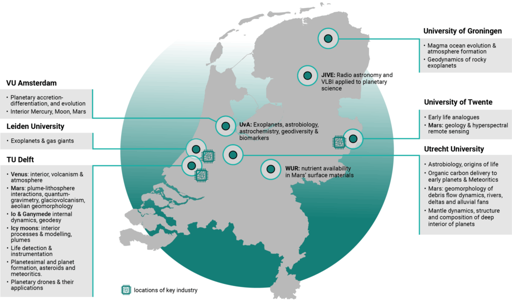 Planetary science is a scientific field situated at the interface of the geosciences and astronomy. Research in this domain relies on methods championed by these respective fields and targets key questions related to planet formation, planetary evolution, habitability and the origins of life. Within the Netherlands the planetary science field is mainly demarcated by research focussed on geoscience topics targeting solar system objects. In parallel important interfaces and collaborations with astronomy subfields have evolved, where planetary geoscience and (exo-)planetary astronomy offer complementarity and create an interdisciplinary ecosystem to solve scientific questions of mutual research foci.